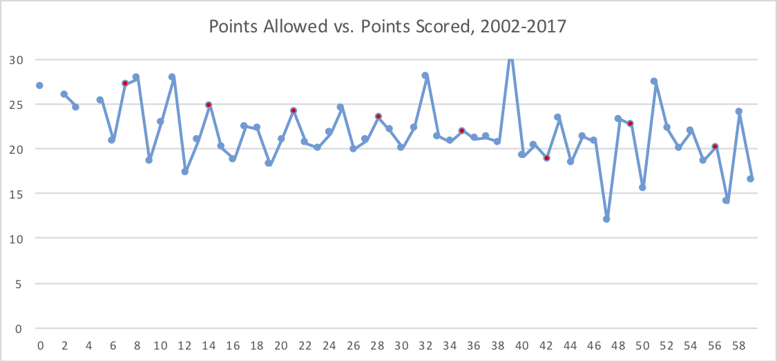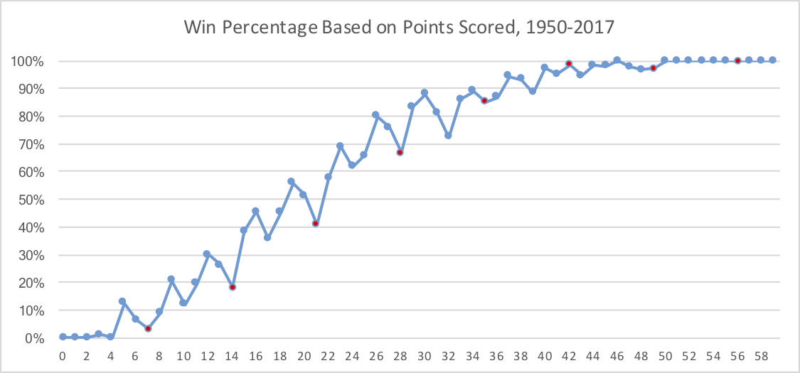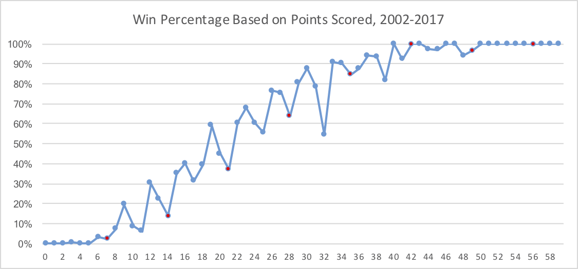 That’s what the graph below shows: the winning percentage, based on points scored, for all points scored totals from zero to sixty. To make it a little easier to follow, I’ve colored in red the multiples of 7; as you can see, those numbers (7, 14, 21, and 28) also represent dips in the graph. What’s interesting is that three field goals is better than two touchdowns across a number of multiples. For example, scoring 9 points is better than scoring 14 points, scoring 16 points is better than 21 points, scoring 23 points is even better than scoring 28 points, and scoring 30 points is better than 35 points. Take a look: