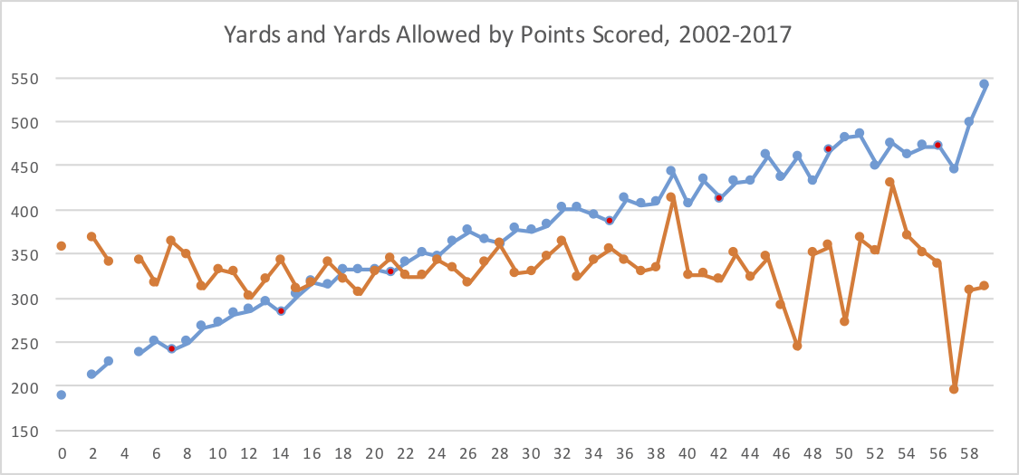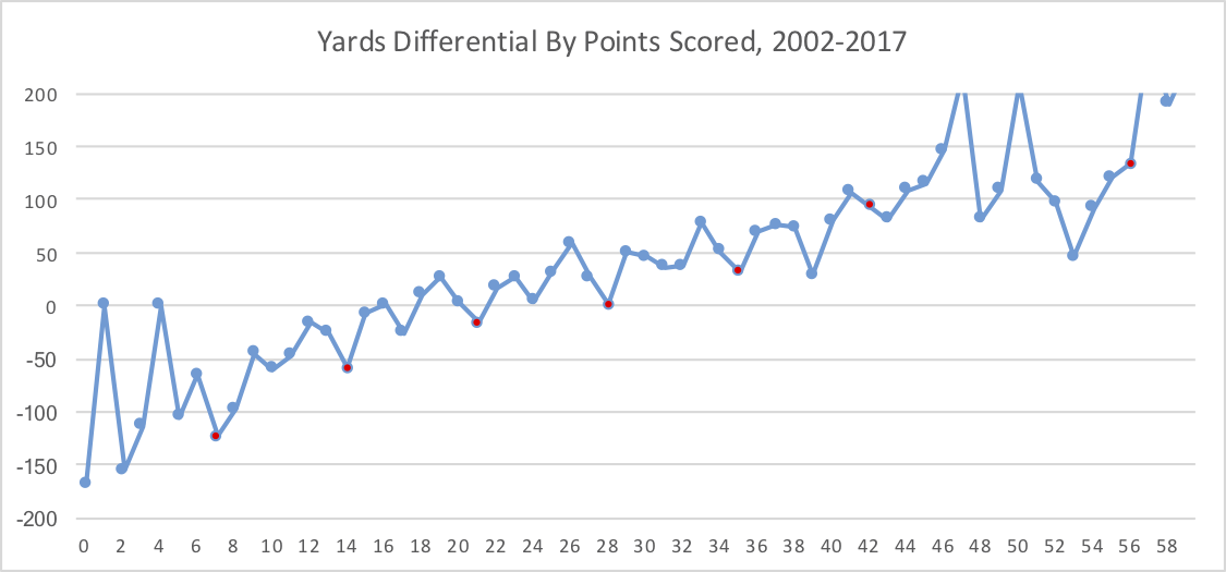 Who would have guessed that, on average, teams that score 16 points and teams that score 28 points both have the same yardage differential? At 16 points, the average (since 2002) is 318 yards and 217 yards allowed; at 28 points, those averages are 361 yards and 360 yards.