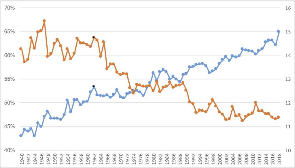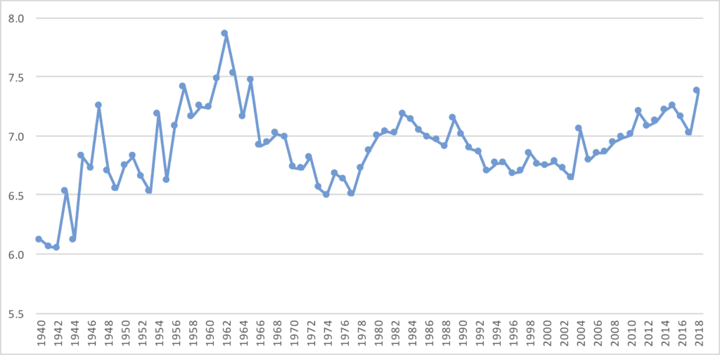 Finally, here is the data from every year since 1940, presented in table form.