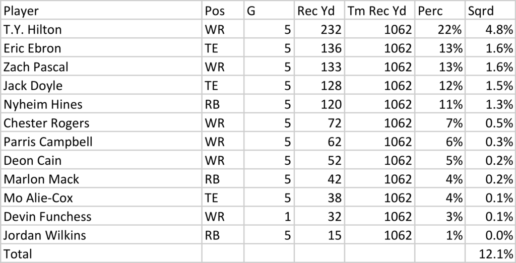 T.Y. Hilton is the team’s leading receiver and has “only” 22% of the team’s receiving yards; Eric Ebron and and Zach Pascal are next on the team and neither has more than 13% of the team’s receiving yards. Indianapolis is the only team in the NFL where its top three leaders in receiving yards have less than half of the team’s receiving yards. The table below shows the Colts receivers; the final column is the square of the percentage of team’s receiving yards, which is how we calculate the concentration index.