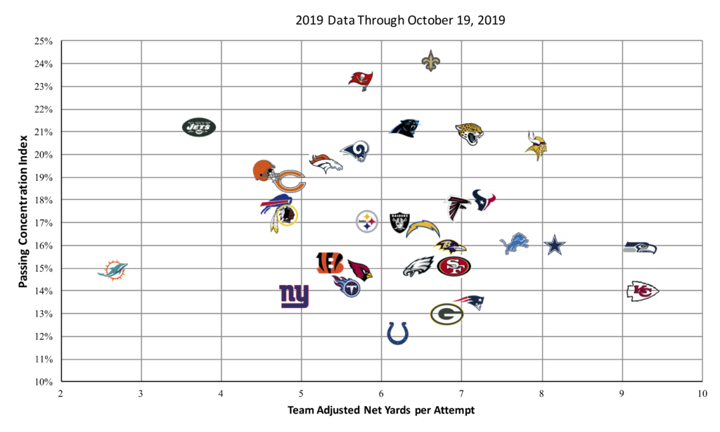 The table below shows the concentration index for each passing offense in the NFL. For those curious about some of the fine print on the concentration index, you can review that here.