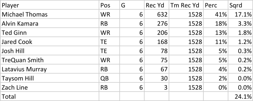 Meanwhile, the Saints are on the other end of the spectrum. Michael Thomas is the engine of the offense: he is responsible for over 40% of all his team’s receiving yards, and is the only player in the NFL who can make that claim. The table below shows the breakdown of the Saints passing offense, which has been the least diverse in the league.