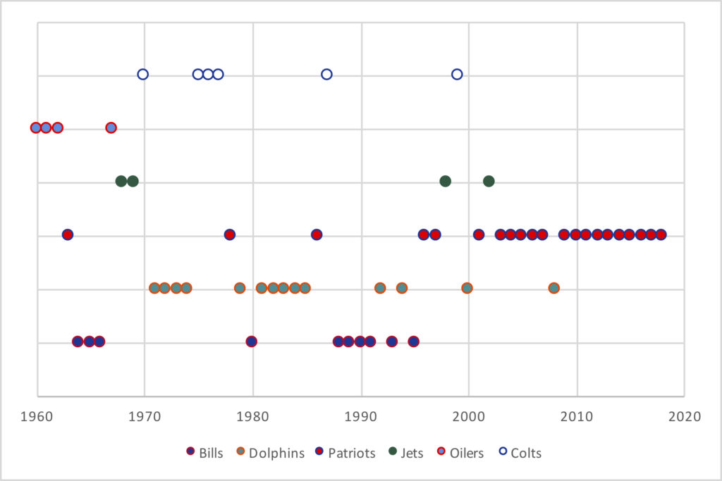 The graph below shows the winner of the AFC/AFL East in each year of existence.