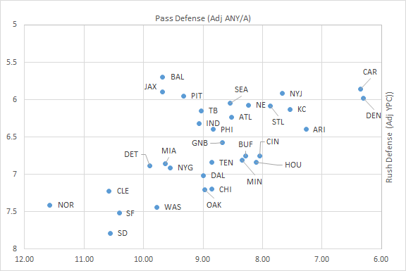 In the graph below, I’ve plotted each team’s defense. The X-Axis represents Adjusted ANY/A allowed, while the Y-Axis shows Adjusted YPC allowed. Given that I like to see the best units in the upper right corner, I have plotted all values in reverse order.