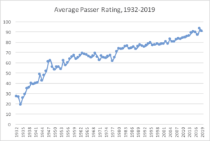 That sounds like a huge drop — 9.4 points per game and 2.42 ANY/A — but the sample size is small.  Brady played poorly in the two regular season non-Gronk games, an upset loss to Miami and a narrow win over Tampa Bay.   Those were two of his worst games of the season, which probably wasn’t just a coincidence. I don’t want to make much out of a 3-game sample size, but putting aside the magnitude, the direction is consistent with other years.