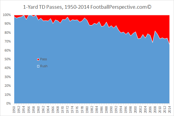 The first graph shows the percentage of 1-yard touchdowns that were rushing touchdowns or passing touchdowns in each year since 1950. As you can see, while the majority of all 1-yard scores are still rushing touchdowns, the ratio has changed considerably over the last 40 years.