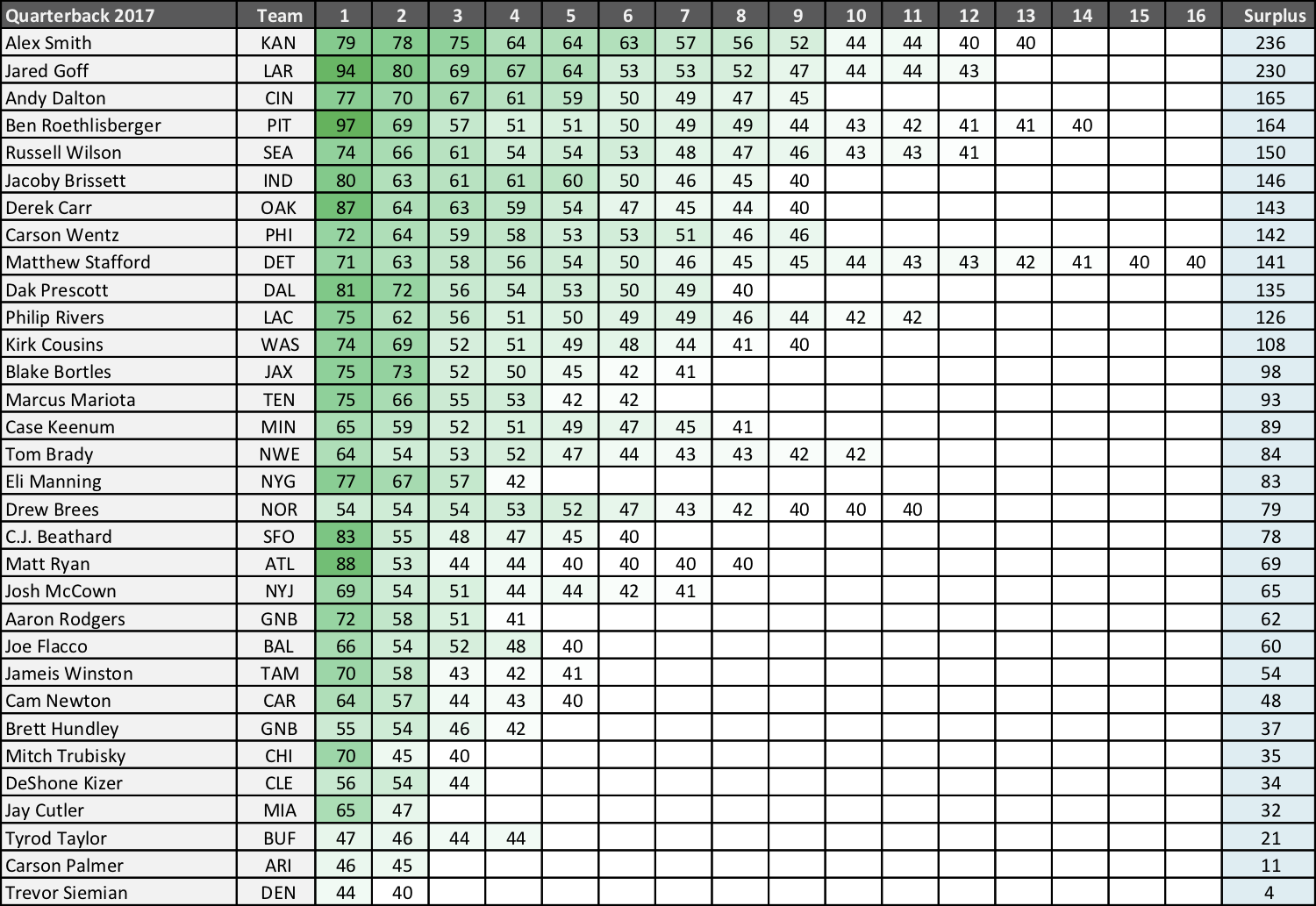 Having established in the above footnote that surplus yards are random and not indicative of QB skill, let’s take a look at the qualifying quarterbacks from 2017. The chart below shows every 40+ yard completion from each QB along with his total surplus yardage. For example, Alex Smith had 13 long passes of 40+ yards; his longest pass went for 79 yards, his second-longest pass for 78 yards, his third-longest for 75 yards, etc. That means his longest pass had 39 Surplus Yards, his second-longest completion had 38 Surplus Yards, and so on; all told, he had 236 Surplus Yards last season, the most in the NFL.