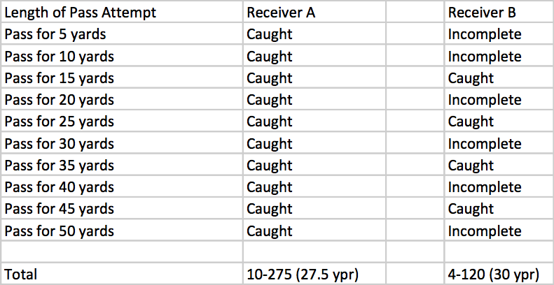 Receiver A caught every pass thrown to him, and averaged 27.5 yards per catch. Receiver B, had he caught every pass thrown to him, would have averaged 27.5 yards per catch, too. Instead, though, he didn’t catch some of the easy ones, and the lack of short catches inflated his yards per reception average to an even 30.