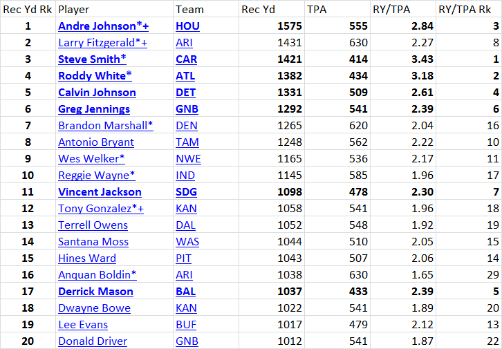 Smith, White, and Johnson all were within 100 receiving yards of Fitzgerald and played on teams that had over 100 fewer pass attempts. It doesn’t feel like a stretch to say that they were more productive. Jennings becomes a closer case, and it’s easy to make arguments for Fitzgerald over Jackson and Mason (bolded above). But I think Johnson, Smith, White, and Johnson all have clear arguments over Fitzgerald for 2008. It’s also worth noting that Fitzgerald only had 29% of Cardinals receiving yards that year, which ranked 17th in the league. Mason, for example, had 34% of Baltimore receiving yards, while Jennings had 32% of Packers receiving yards (Jackson had only 27% of Chargers receiving yards; the difference there being he played with a star quarterback that season, so he does better in RY/TPA than percentage of team receiving yards).