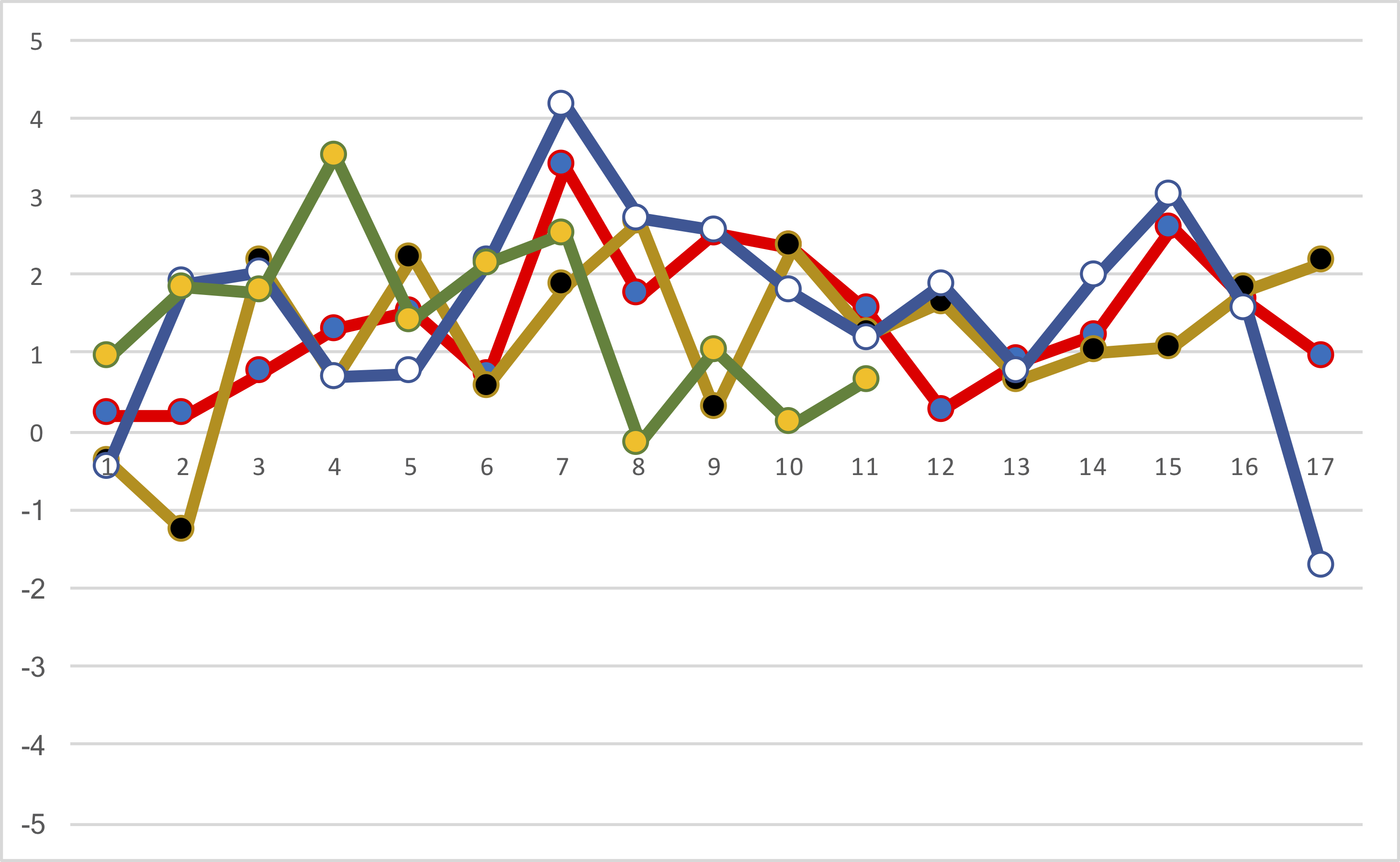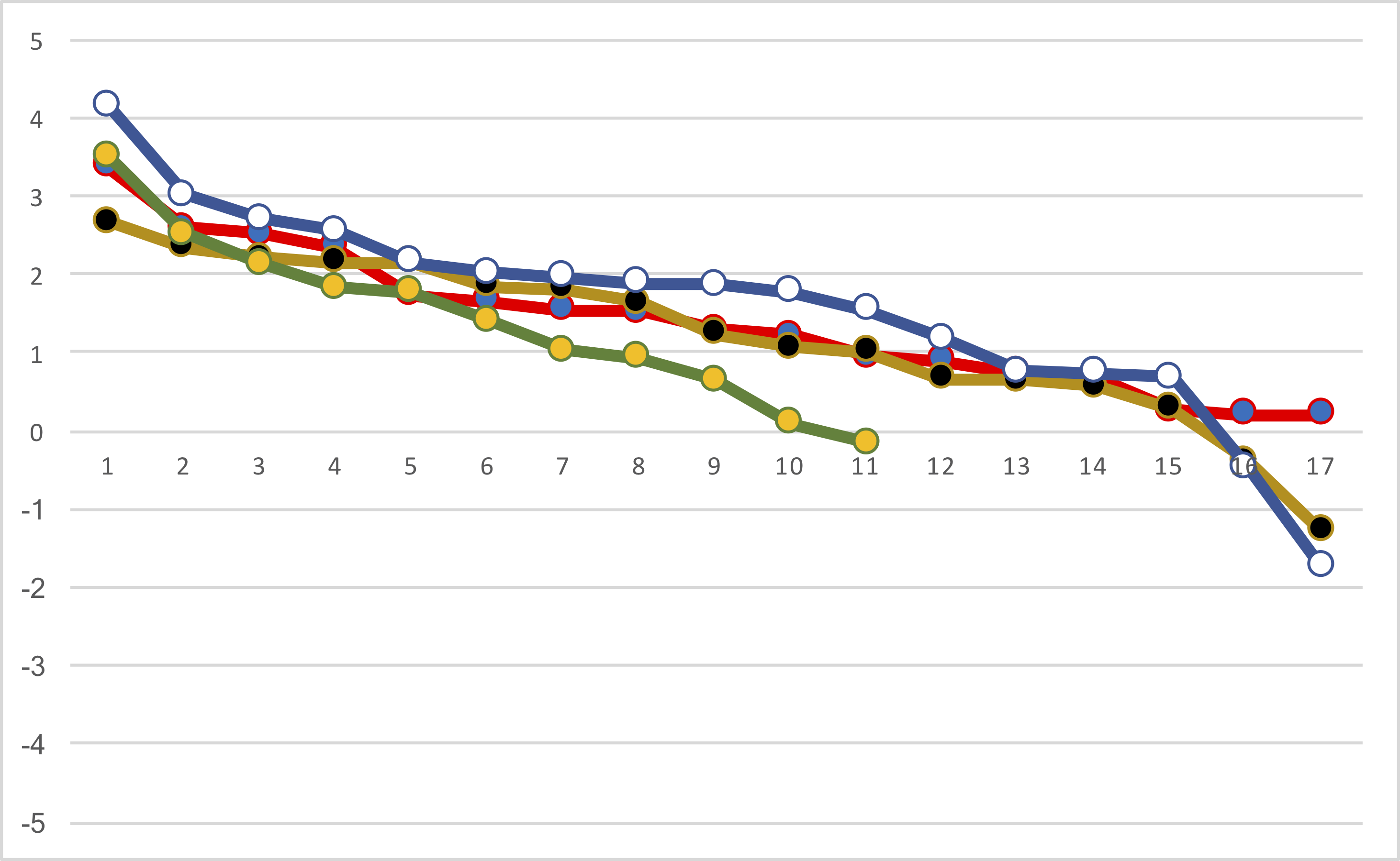 First, let’s do it by chronological year. This means Manning’s graph starts early but ends, while Rodgers doesn’t get started until 2008. I have used blue/white for Manning, red/blue for Brady, gold/black for Brees, and green/gold for Rodgers.
