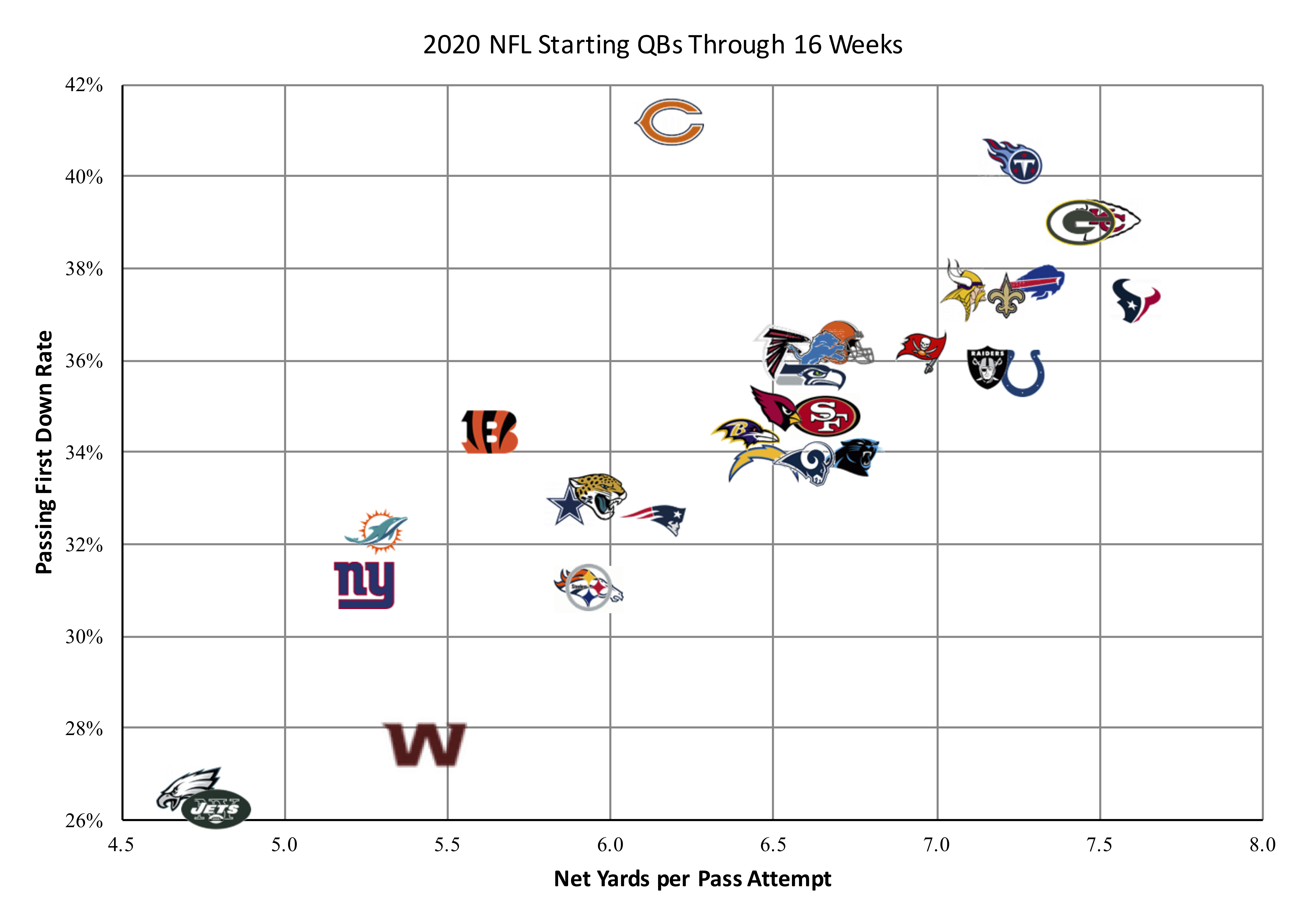 So what is going on? Trubisky seems like a large outlier; is he? I looked at how many net yards per pass attempt each starting quarterback has gained this year, and plotted that next to their passing first down rate. That is shown in the graph below, which is individual quarterback data and not team data. For the 6 teams that do not have one quarterback who started at least 10 games, I am using Trubisky over Nick Foles, Tua Tagovaiola over Ryan Fitzpatrick, Andy Dalton over Dak Prescott, Nick Mullens over Jimmy Garoppolo, Gardner Minshew II in Jacksonville, and Alex Smith over Dwayne Haskins.