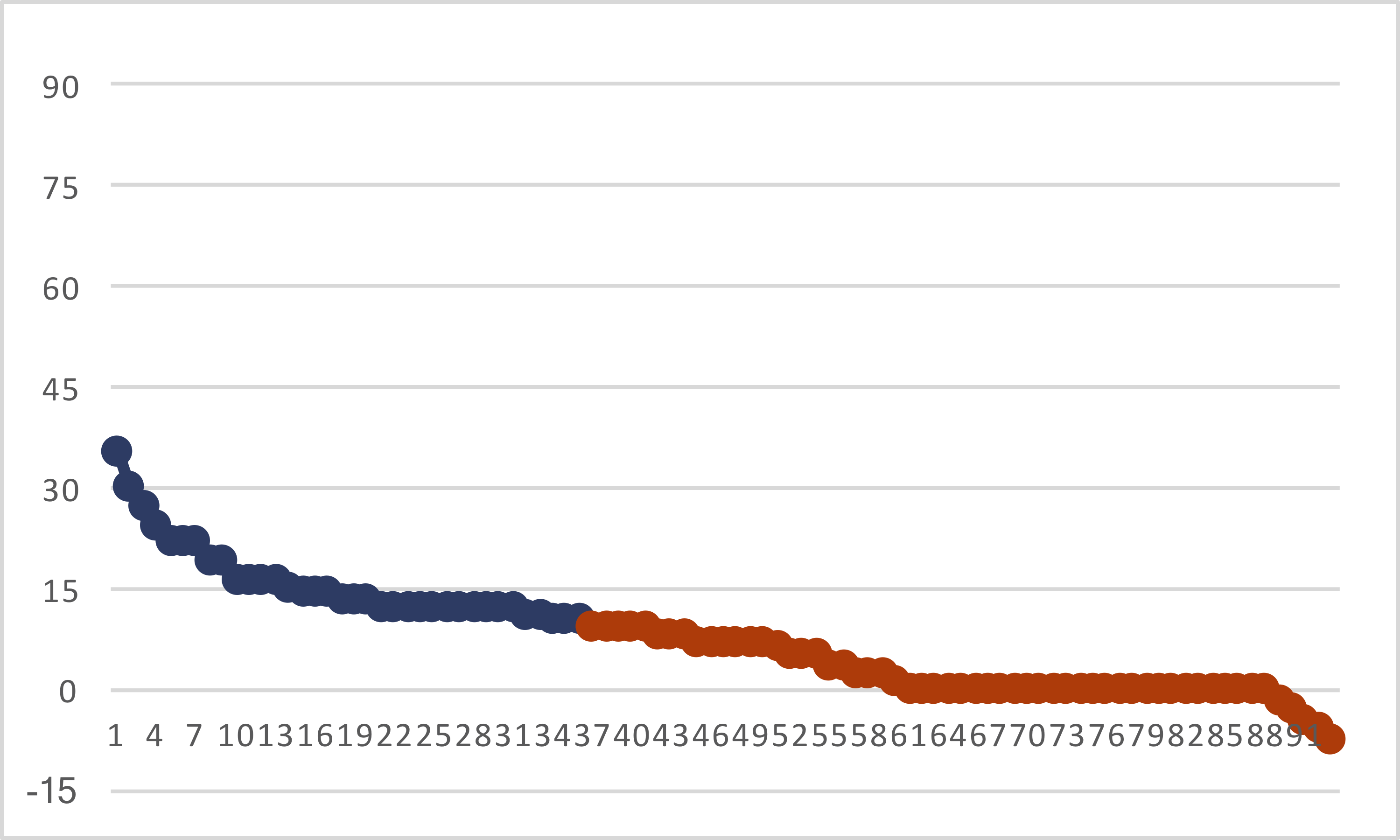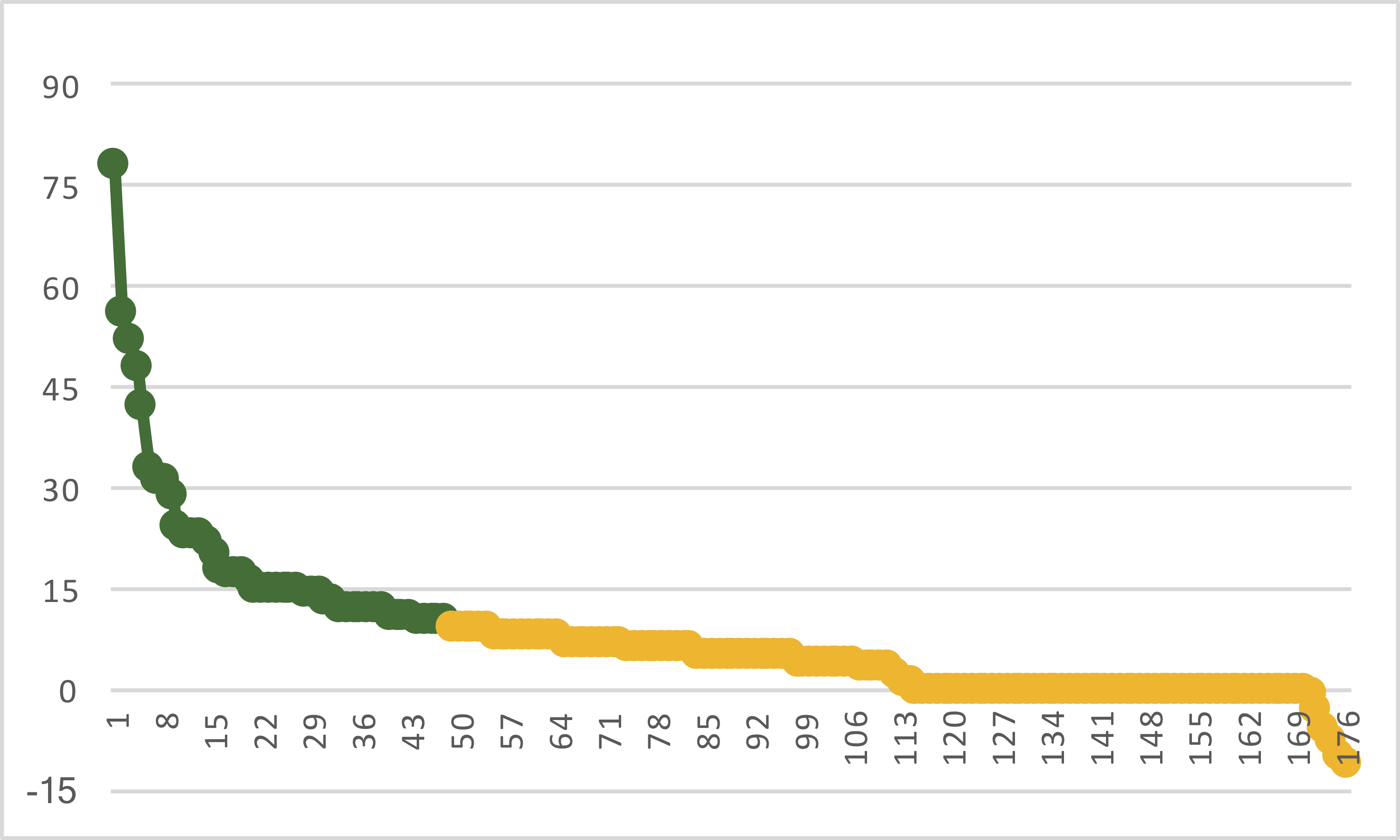 So what is happening? The two players are both completing 68% of their passes, but Rodgers has completions of 78, 56, 52, 48, and 42 yards. Let’s plot how many passing yards each quarterback has gained on 1st-and-10 in team colors; dark colors means the play gained at least 10 yards for a first down, while the lighter color means the play gained less than 10 yards. I am using the same Y-scale for both players, going from -15 yards to 95 yards. The X-Axis is just play number, sorted from most yards to fewest.