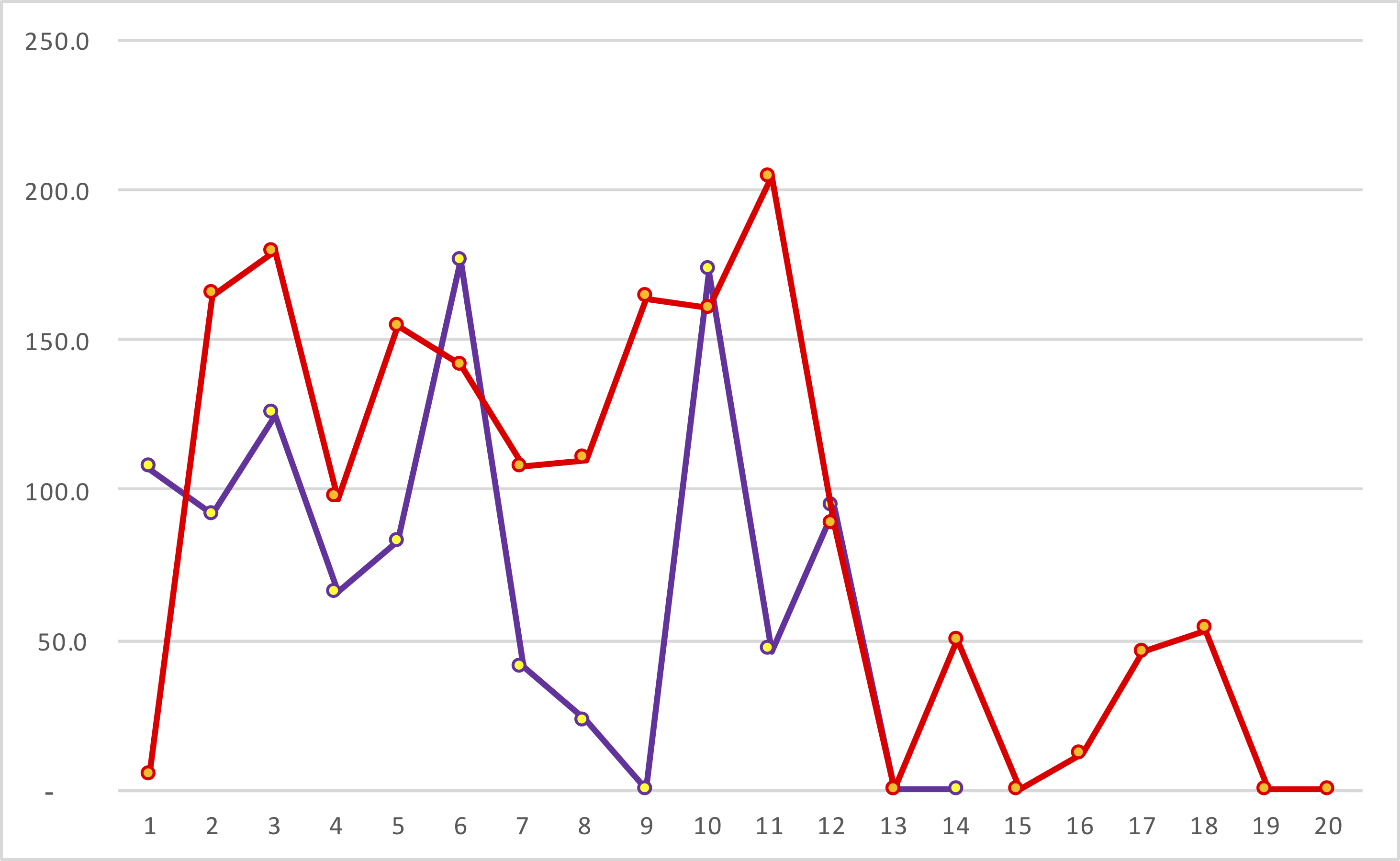 Regardless of where you put Chandler, Rice’s dominance is jaw-dropping. He has 5 of the top 10 fantasy seasons by a WR, and 7 of the top 25! As good of a wide receiver as he was, he may have been an even better fantasy player due to his remarkable scoring ability. From a fantasy perspective, the only wide receiver who is within shouting distance of Rice is Randy Moss, but Rice has 7 seasons with 140+ points of VBD, while Moss has only 2 (’03, a less memorable year for him because Minnesota missed the playoffs, and ’07). The graph below shows their VBD by year: