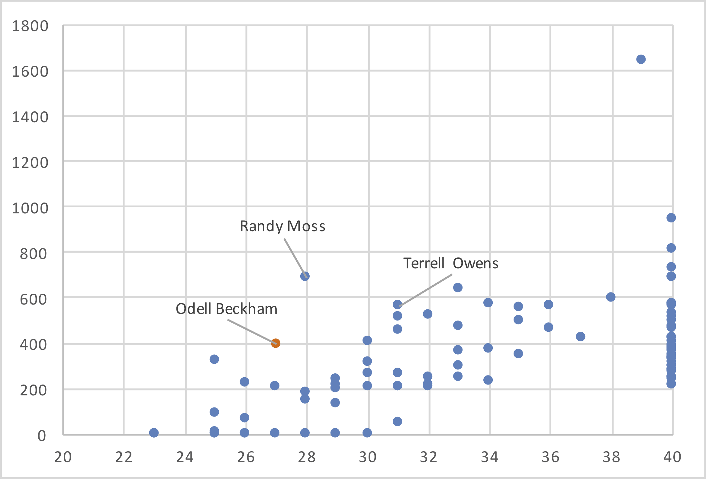 As for Beckham, he ranks 4th in career VBD through age 26 among all wide receivers to enter the NFL since 1970. The top three? Randy Moss, Jerry Rice, and Larry Fitzgerald.