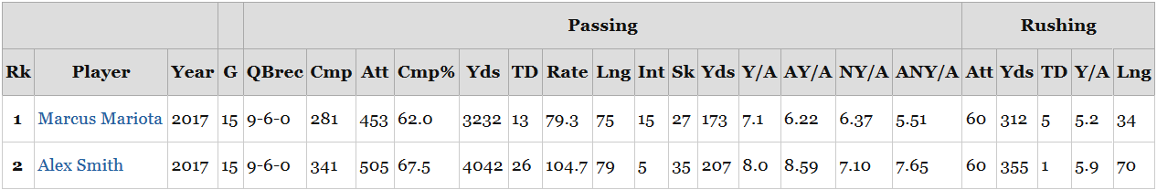 Atlanta fans, meanwhile, have spent the season complaining about their offensive coordinator. Kyle Shanahan (HC SF) is gone, and Steve Sarkisian’s offense hasn’t lived up to the absurd expectations set by the 2016 Falcons. The table below shows Ryan’s 2016, Ryan’s 2017, and Goff’s 2017. The results speak for themselves: