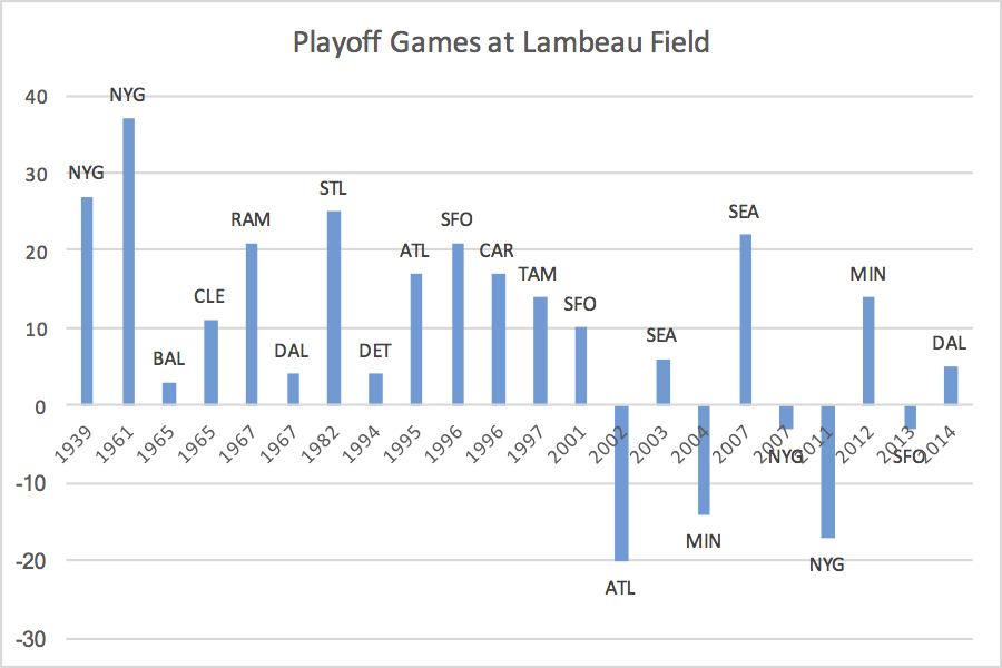The Packers won every home playoff game for over 60 years. Green Bay was 13-0 at home in playoff games until Michael Vick and the Atlanta Falcons won as 6.5-point underdogs at the end of the 2002 season. Since that 13-0 start, the Packers are a much less intimidating 5-4 in the postseason. Below is the points differential in every playoff game in Green Bay in NFL history: