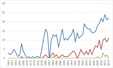 The graph below shows the number of 3,000 yard passers in blue, 4,000-yard passers in red, and 5,000-yard passers in green in each season since 1960. As you can see — and no doubt already knew — passing productivity is on the rise: