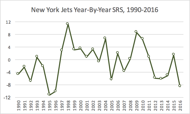 The Jets have not exactly been a powerhouse franchise in NFL history, and that’s true in recent years, too. But the Jets were legitimate Super Bowl contenders in 2009 and 2010, making the AFC Championship Game both years. Take a look at the Jets yearly SRS grades from 1990 to 2016, and ’09 and ’10 stand out as the last great Jets teams: