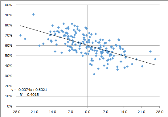 In other words, for about every 4 points of Game Script, you would expect a team’s Pass Ratio to decline by nearly 3 percent. A team with a Game Script of +8.0 would be expected to pass on 53.1% of plays, while a team with a -8.0 Game Script would be expected to pass on 64.4% of plays.