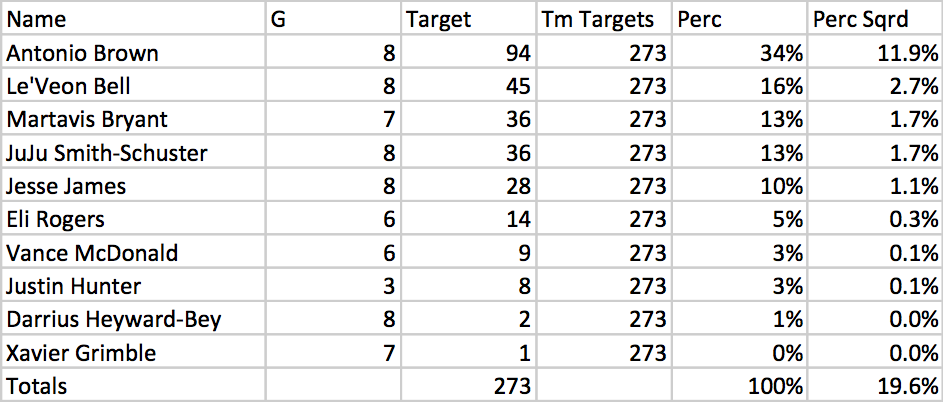 One way to measures this is to calculate the percentage of team targets had by every player on each team, square that result, and sum those squared results to get a team grade. Let’s use the Steelers as an example. Pittsburgh has 273 team targets this year, and star receiver Antonio Brown has seen 94, or 34%, of those targets. The square of 34% is 11.9%; perform those calculations for every Steelers who has a target this year, and the sum of those squares is 19.6%.