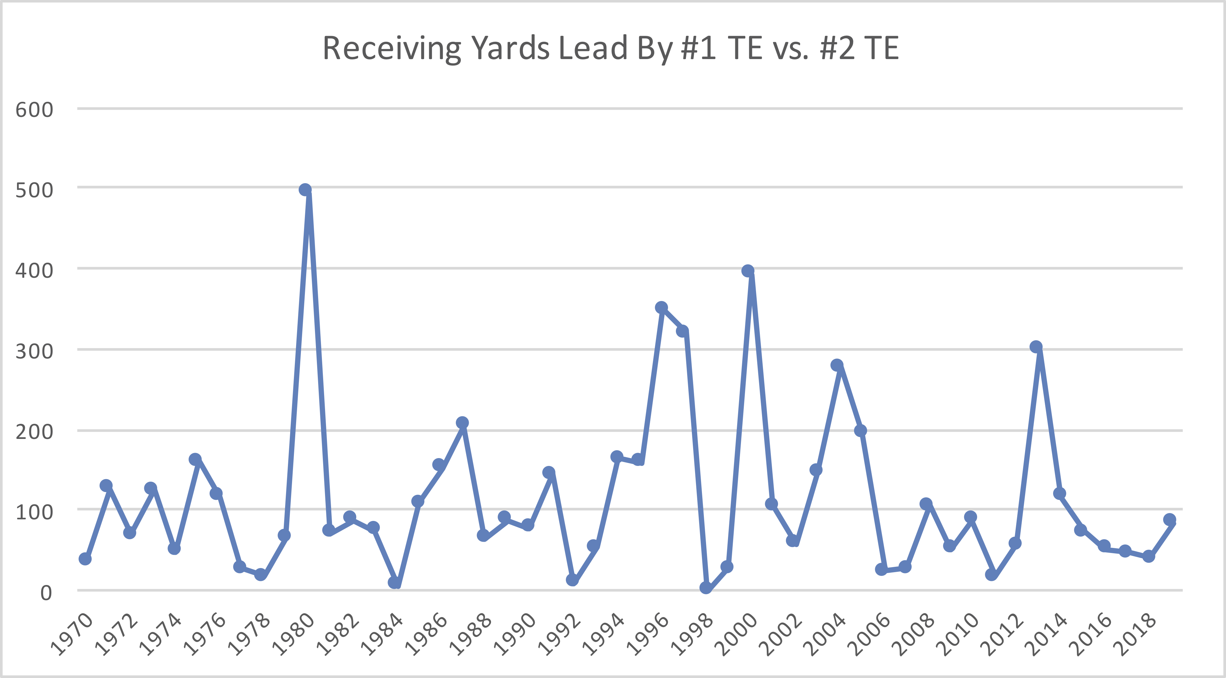 Interesting trivia aside, I didn’t bring up the 20-year intervals at random. Those two seasons represent the largest difference in receiving yards between the top tight end and number two tight end in history. [1]I will note that there is some ambiguity in position labels from the early 1960s, and you may be able to argue that say, Mike Ditka had a larger lead if say, you want to quibble with calling Monty … Continue reading Sharpe’s advantage was 393 yards, while Casper’s edge was a mammoth 494 yards. But Kelce is on pace to shatter that record, and should easily win the receiving TE crown by around 600 yards. It is even possible, if unlikely, that he will have more than twice as many yards as every other tight end in the NFL. Kelce, like Winslow in 1980, is second in the AFC in receiving yards and second on his own team: Tyreek Hill leads all AFC players with 1,021 yards, second in the NFL only to Seattle’s D.K. Metcalf (1,039).