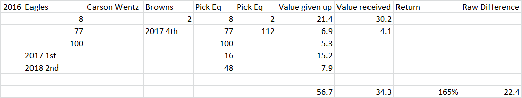 In 2016, Philadelphia sent the 8th, 77th, and 100th selections in the Draft, along with a 2017 1st and a 2018 2nd, to the Browns for the second overall pick (i.e., the right to obtain Carson Wentz) and a 2017 4th rounder. The 8th, 77th, and 100th picks are worth 21.4, 6.9, and 5.3 points, respectively; if we value the 2017 1st as the 16th pick and with a 90% discount, and the 2018 2nd as the 48th pick and with a 20% discount, those picks are worth 15.2 and 7.9 points. That means Philadelphia sent a total of 56.7 points of draft value for Wentz and 4.1 points of value (the discounted value of the 112th pick in the 2017 Draft).
