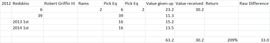 Even giving discounts of 10% and 20% on those two future picks, this was an enormous haul…. and it ignores that the 2014 pick turned out to be the 2nd pick in the draft (less exciting for Rams fans: it was used on Greg Robinson). Washington gave up an incredible 63.2 points of draft value for the right to select Griffin.