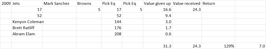 Those players had value to Mangini, but I doubt New York could have traded them for much in the way of draft value; for purposes of this trade, I valued them as mid-5th, mid-6th, and mid-7th round picks. But either way, the Jets didn’t give up a crazy amount to get Sanchez.