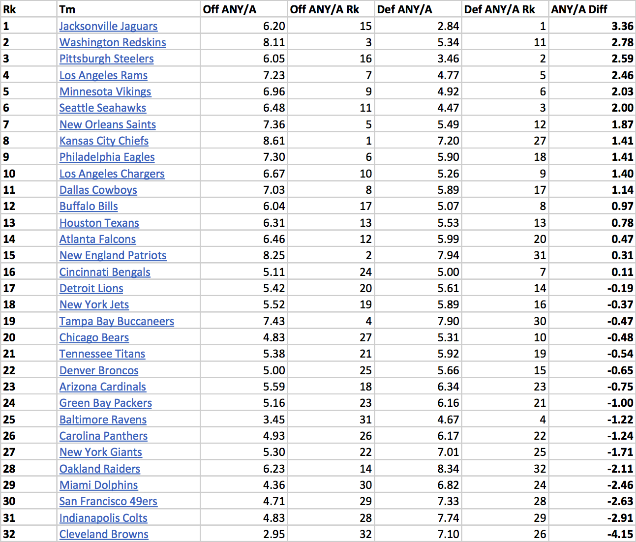 Jacksonville ranks 2nd in the NFL in points differential at +73. So… are the Jaguars actually good? Well, through seven weeks (but before Monday Night Football), Jacksonville also leads the NFL in Adjusted Net Yards per Attempt differential, which would have sounded impossible two months ago (especially if you knew Allen Robinson would tear his ACL one catch into the season):