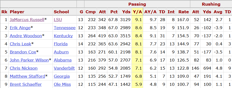 And Russell? Well, he led the SEC in Y/A and AY/A and also completion percentage in his final season. He had fantastic rate stats and gross stats playing in the toughest conference in football, on top of being an incredible physical specimen.