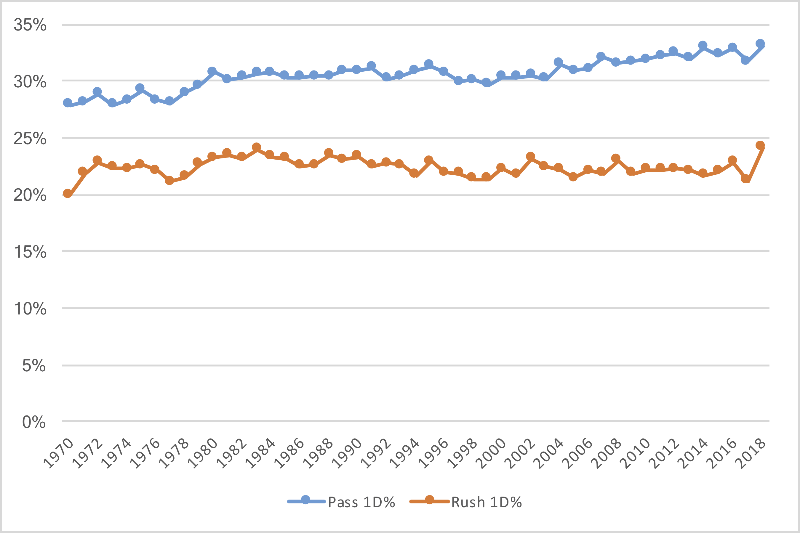 The graph below shows the percentage of rushing plays that picked up a first down, and the percentage of passing plays (including sacks) that picked up a first down, for each year since 1970.