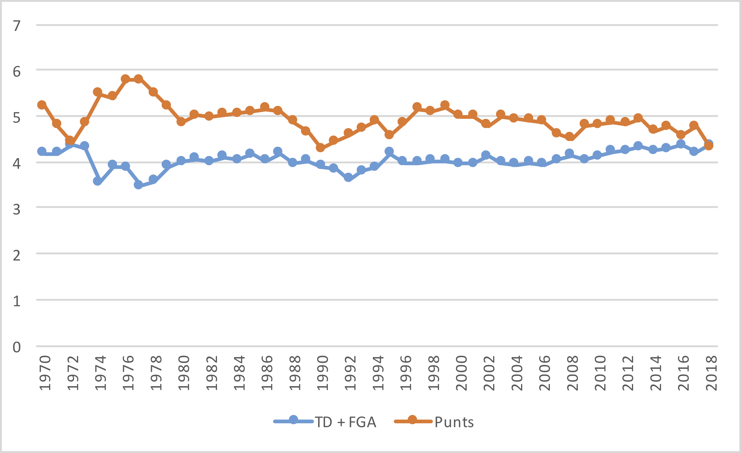 The graph below shows the number of punts per team game, and the number of combined touchdowns and field goal attempts per team game, for each season since 1970.