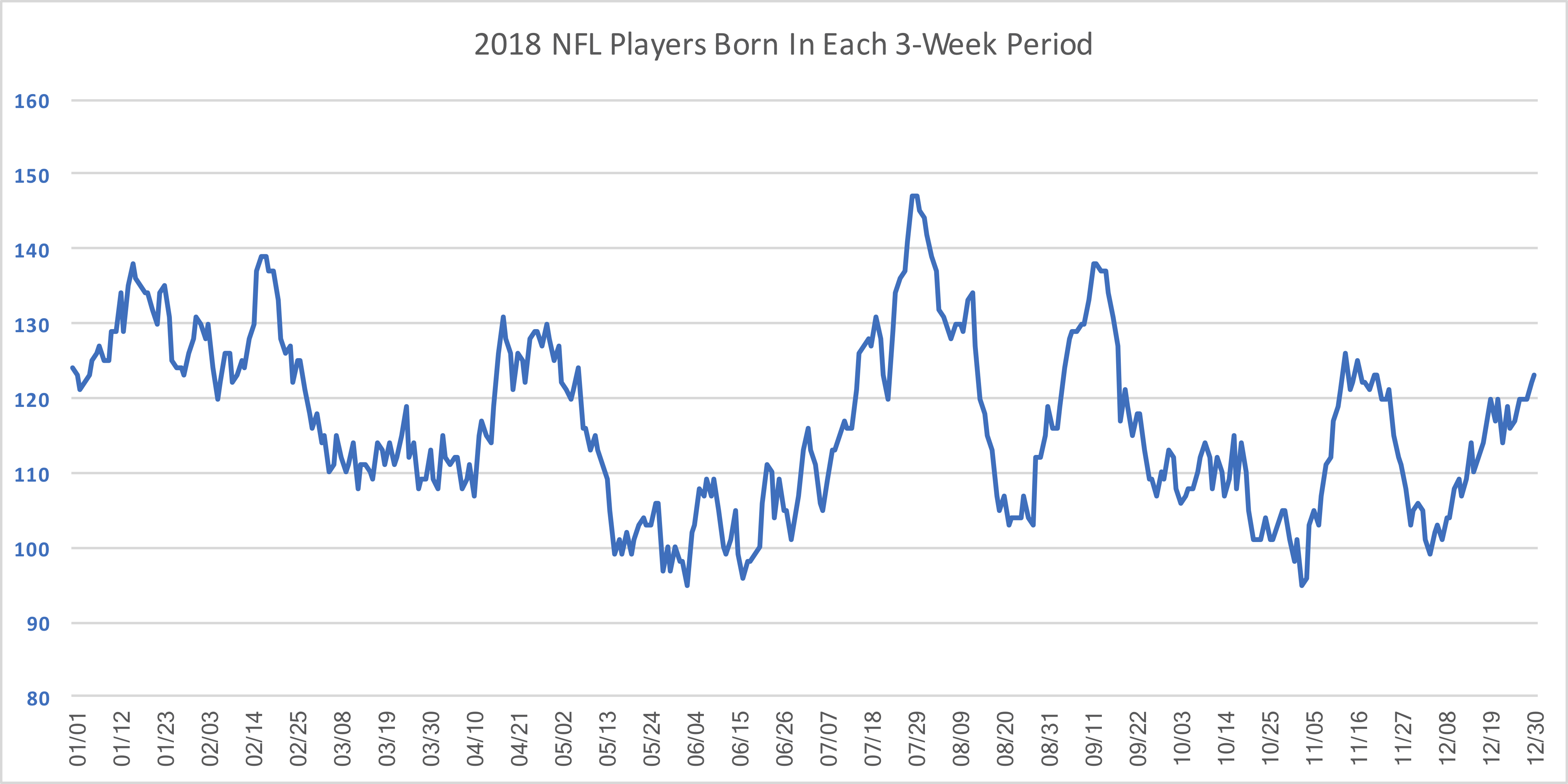 Why did I choose 31 days? Looking at individual birthdays produces a jumbled mess due to the small sample size. There’s nothing weird about July 9th, but it’s a date when only one 2018 NFL player was born. Meanwhile, 6 players were born on July 8th and 8 players were born on each of July 10th, July 11th, and July 12th. I looked at 21-day periods, and while the results look a little different, it still feels choppy and more likely driven by randomness. But you can see for yourself.