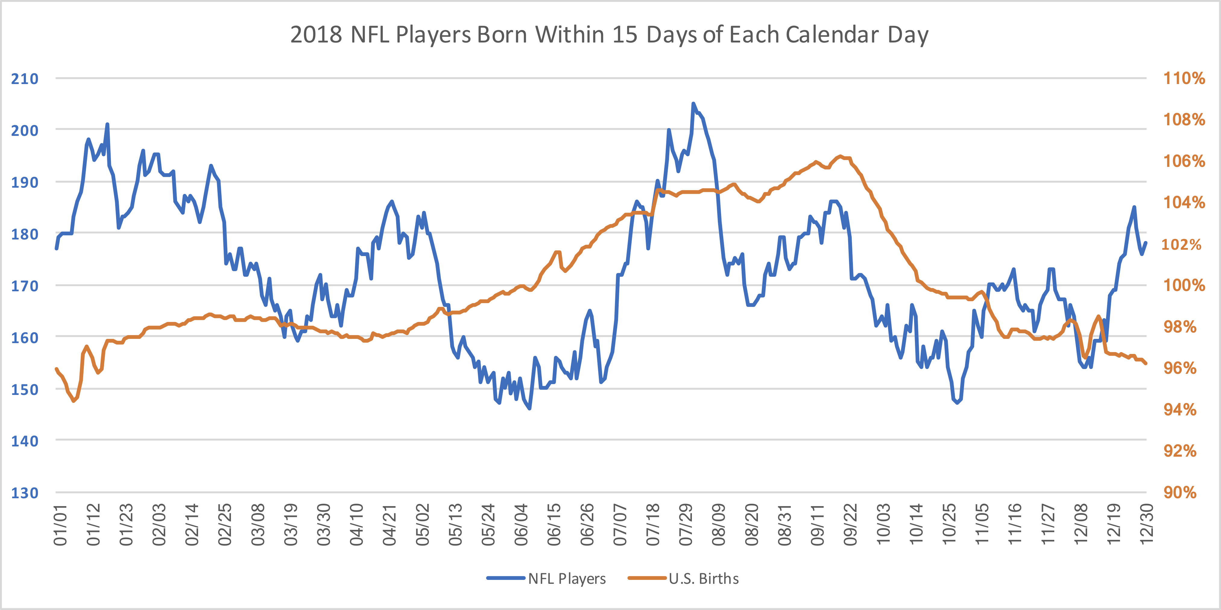 I’ve reproduced the above graph, but this time, I am adding an orange line (plotted against the right Y-Axis) that shows the popularity of each 31-day birth window. This is expressed as a percentage relative to the average calendar date. For example, late December/early January provide the fewest amount of birthdays (about 96% of the average), while late September gives us the most common window (about 106% of average). When you plot these two sets of data together, the results become really interesting. The NFL player data is plotted on the left Y-Axis in blue, while the U.S. birth rate is in orange against the right Y-Axis.