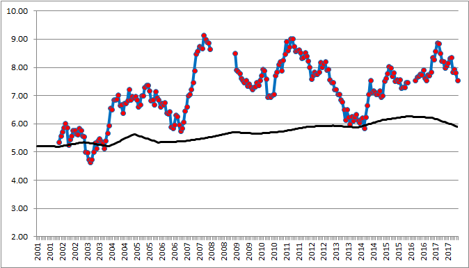 The blue and red line shows Brady’s trailing 16 game Adjusted Net Yards per Attempt. The black line shows the trailing 16 game league average. As you can see, Brady was around league average for awhile, jumped way up prior to 2007, when he jumped way, way up.