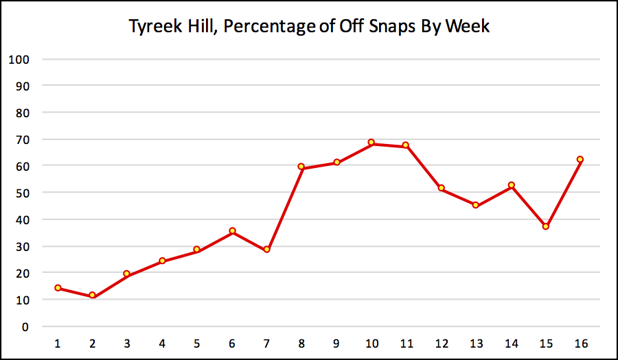 Tyreek Hill was noticeably absent from yesterday’s list of yards from scrimmage leaders. The main reason for that? Hill was a part-time player for the first seven weeks, failing to take the field on even half of Kansas City’s offensive snaps in even a single game. By the end of the year, he was a more regular part of the offense, although he never participated in 70% or more of the Chiefs offensive plays in any regular season game (and in the playoff loss to Pittsburgh, he was present for 69% of Kansas City’s offensive snaps). The graph below shows the percentage of offensive snaps he was on the field each week of the 2016 regular season:
