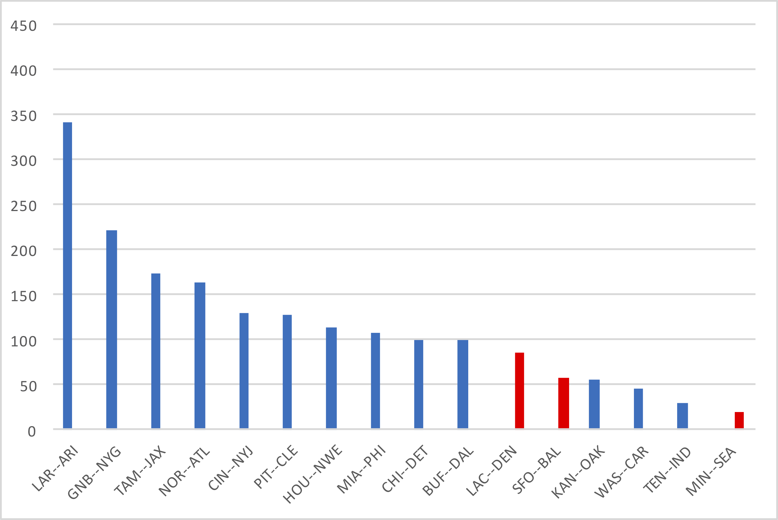 The graph below shows, as usual, the passing differential from each game last week. And as usual, the teams that won the passing battle usually won.