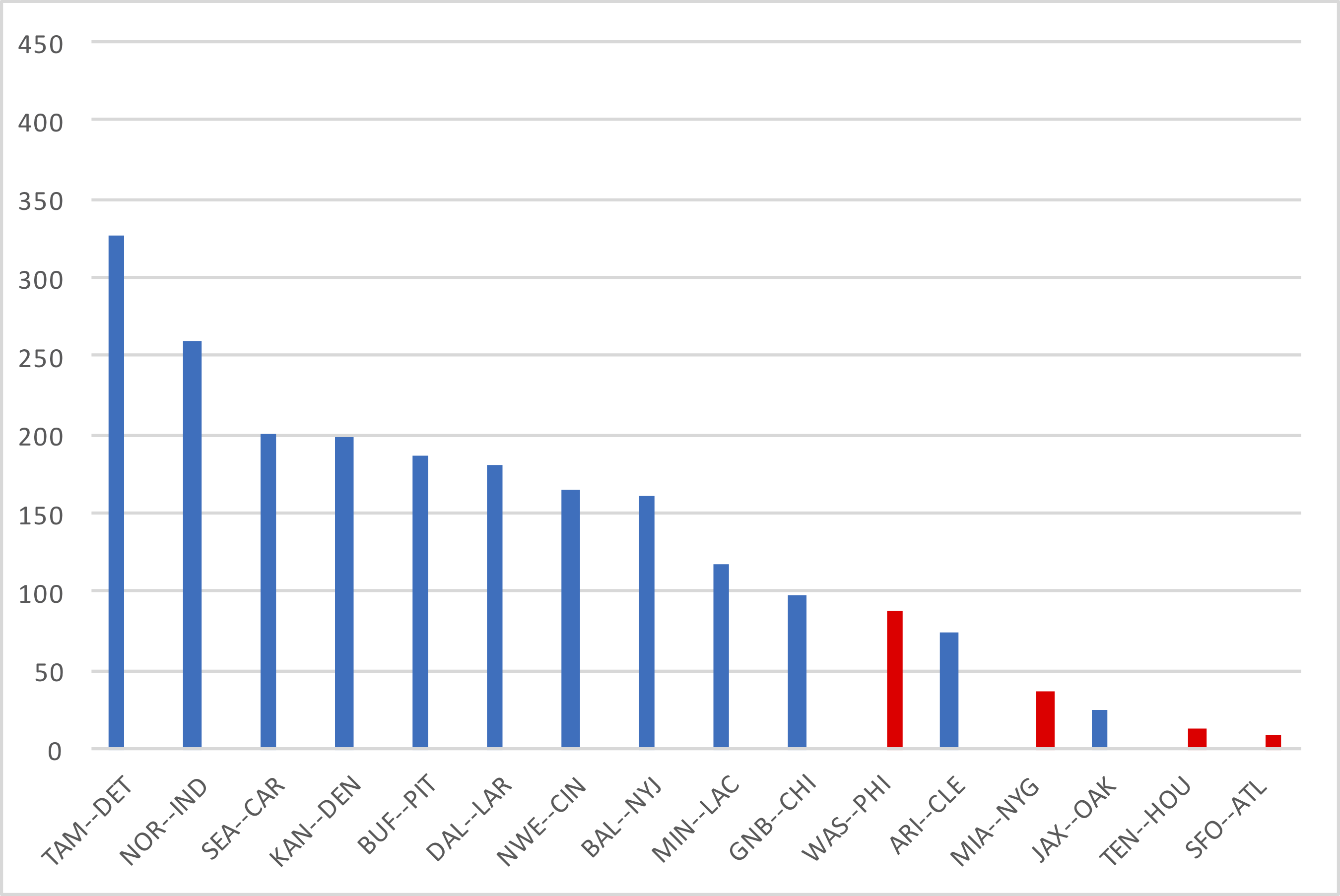 And as always, here is the passing value differential chart. Only three teams — the Eagles and 49ers and Texans (who each barely lost the battle) won with a worse passing differential.
