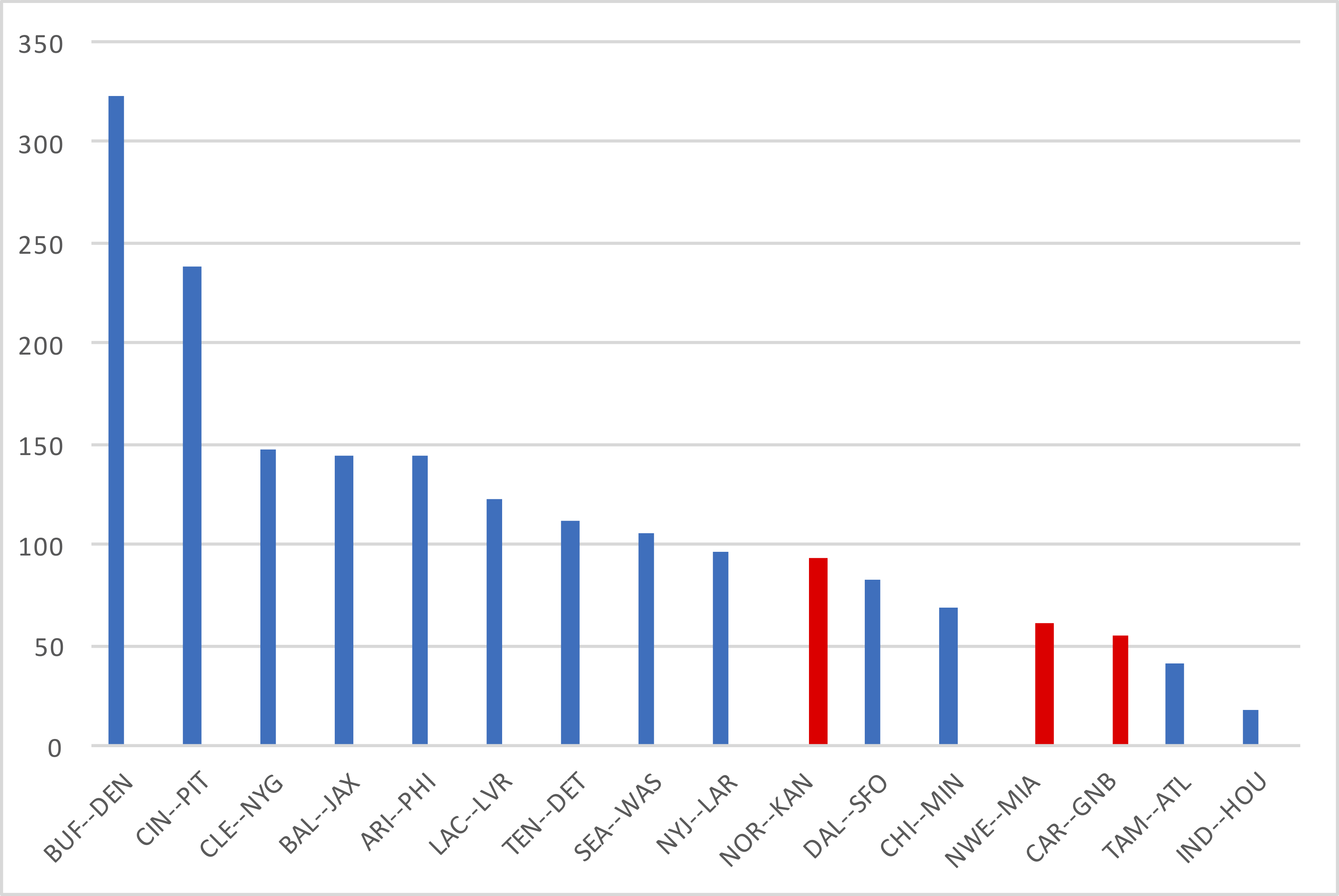 It was a rough week for the two leading MVP candidates. Patrick Mahomes threw 3 TDs and no interceptions and the Chiefs scored 32 points, which maybe is a sign of how high the Chiefs floor really is with Mahomes. But Kansas City punted 6 times, only the second time that’s happened in the Mahomes era, and the Chiefs averaged a poor 4.6 net yards per pass, the worst performance in any of Kansas City’s last 74 games. Meanwhile, the Packers averaged under 3 net yards per attempt, an extremely rare result for Green Bay over the last 25 years. In fact, it was only the fourth time since Rodgers became a starter that he averaged under 3 net yards per pass attempt for a game. Aaron Rodgers threw for just 8 first downs on 34 dropbacks, one of the worst performances of his career. But no matter: both the Packers and Chiefs rode to relatively easy wins.