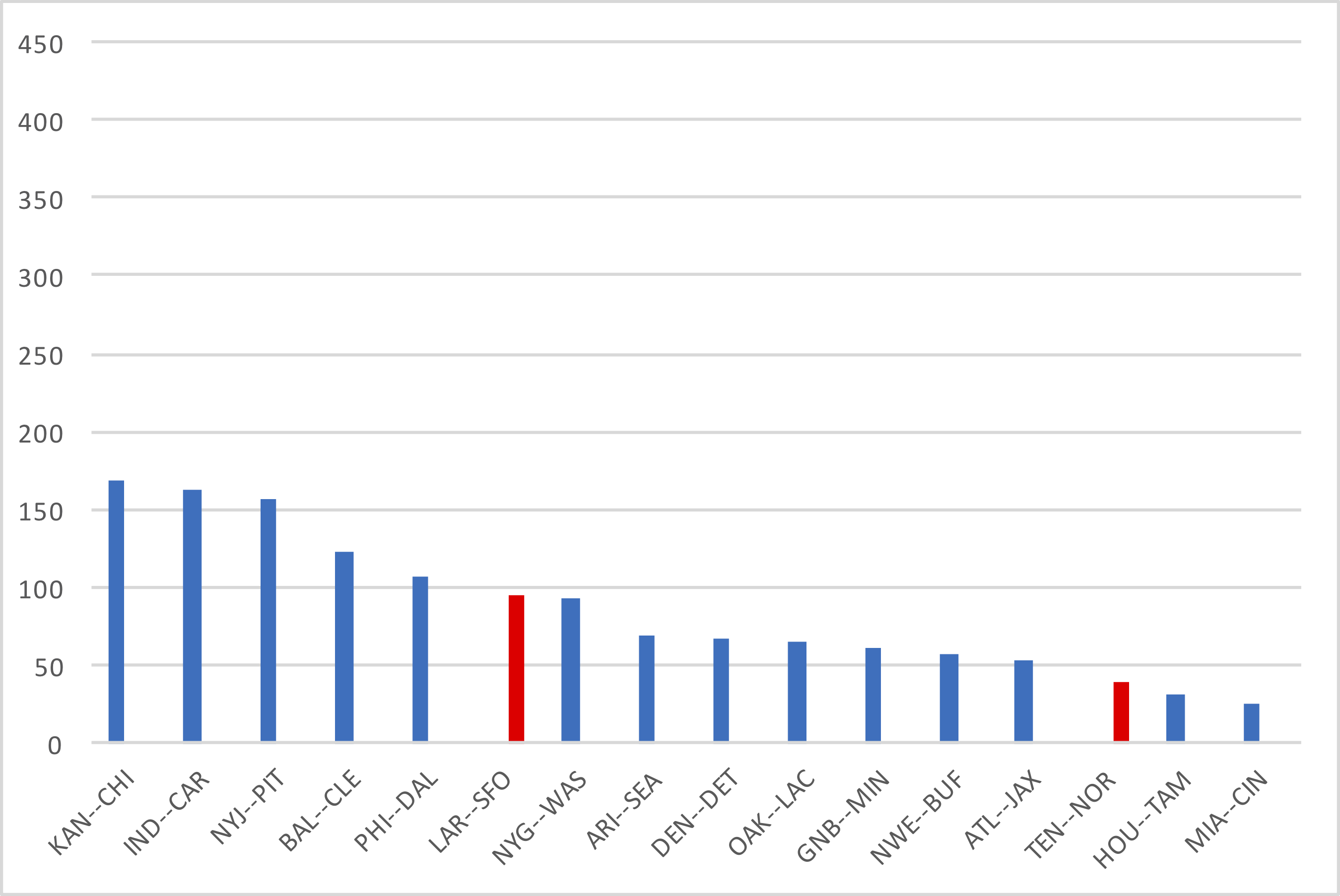 One game that did see the worse passing team win was the 49ers/Rams matchup. Statistically, Jared Goff far outplayed Jimmy Garoppolo. One reason: Goff’s lone interception was a 46-yard pick six, while Garoppolo’s two interceptions were less costly (one led to a missed field goal). San Francisco also ran for about 50 more yards on the same amount of carries (excluding kneels), and had an 81-yard kickoff return that led to a field goal.