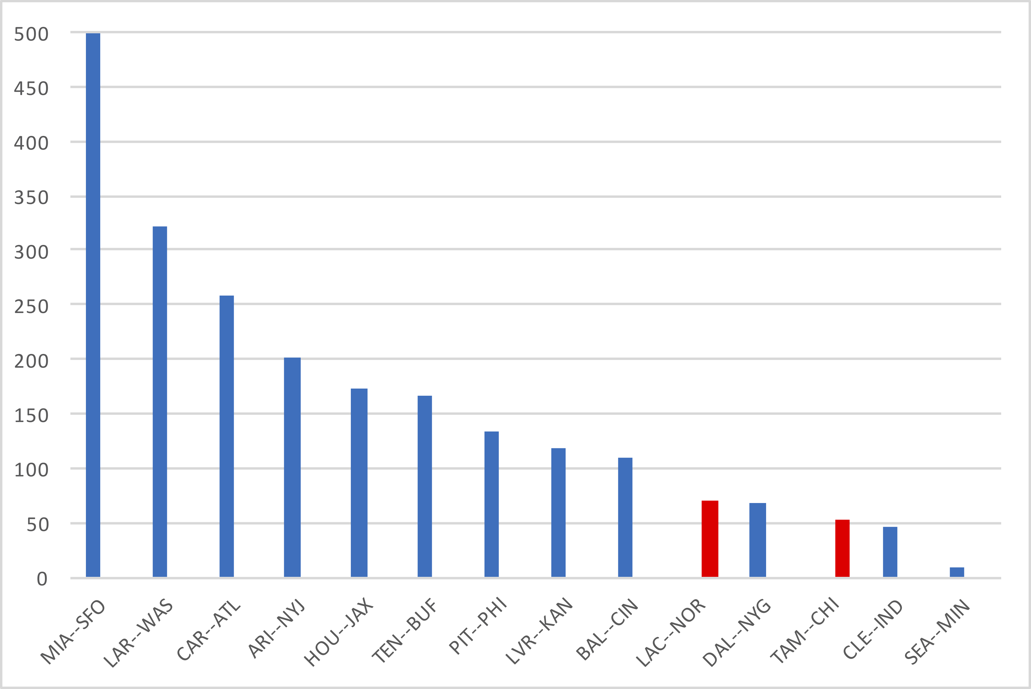 Speaking of one-sided disaster games, the Dolphins/49ers game is one of the great passing mismatches in recent history. Passer rating has its flaws, but you are not going to lose any games where you nearly quadruple your opponent’s passer rating.