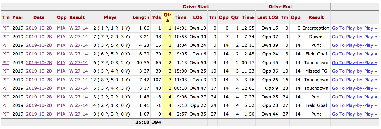 I will give credit to Pittsburgh for “not giving up on the run” in this game. Pittsburgh’s 57% pass ratio is actually a bit run-heavy for a team with a negative 3.0 Game Script, but this wasn’t a case where the Steelers passed to come back and then ran out the clock. The Steelers generally stuck with the ground game throughout, other than the two minute drill to end the first half.