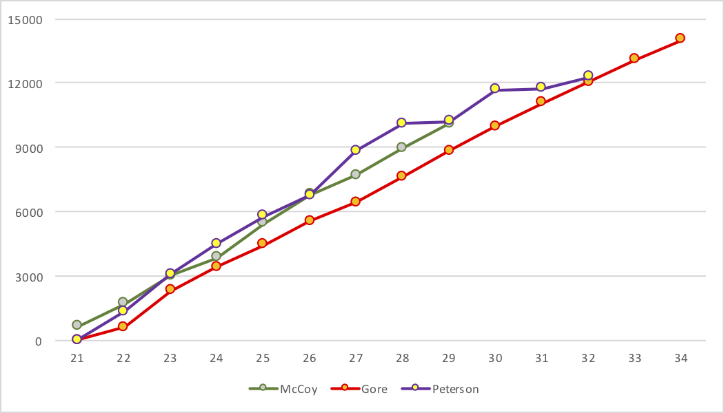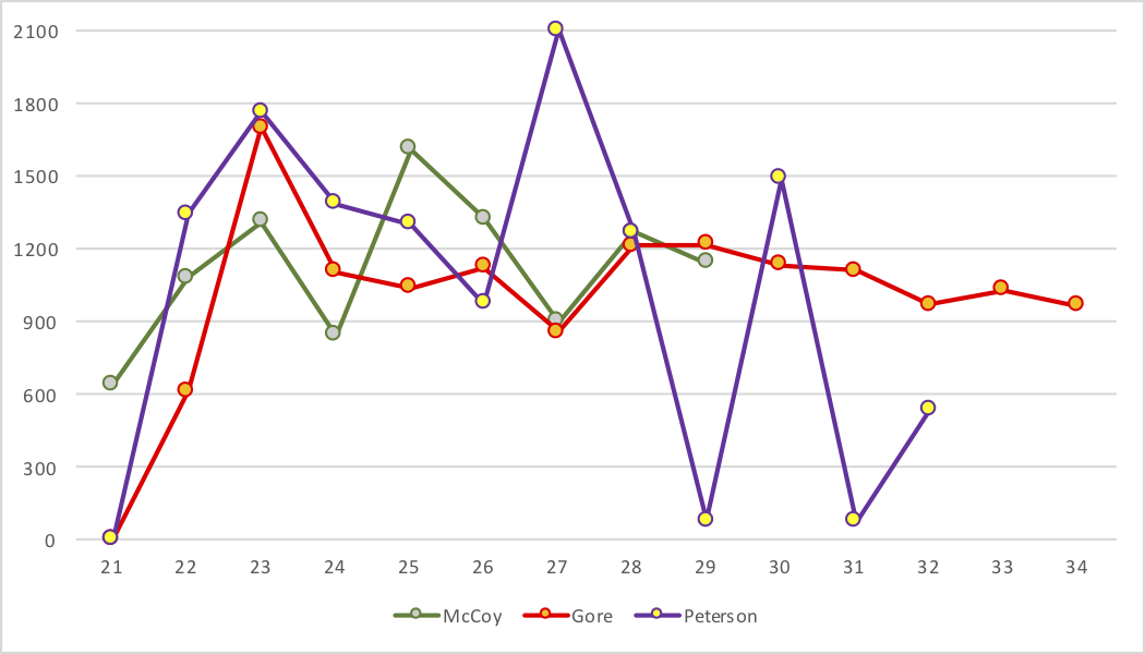 All three had big, All-Pro type years at age 23 and strong years at age 24, with McCoy probably being the worst of the three. At ages 25 and 26, McCoy was even better while the other two declines; at ages 28, 29, and 30, McCoy and Gore had nearly identical rushing numbers, while Peterson was all over the map, but all three averaged between 1075 and 1150 rushing yards during those years.
