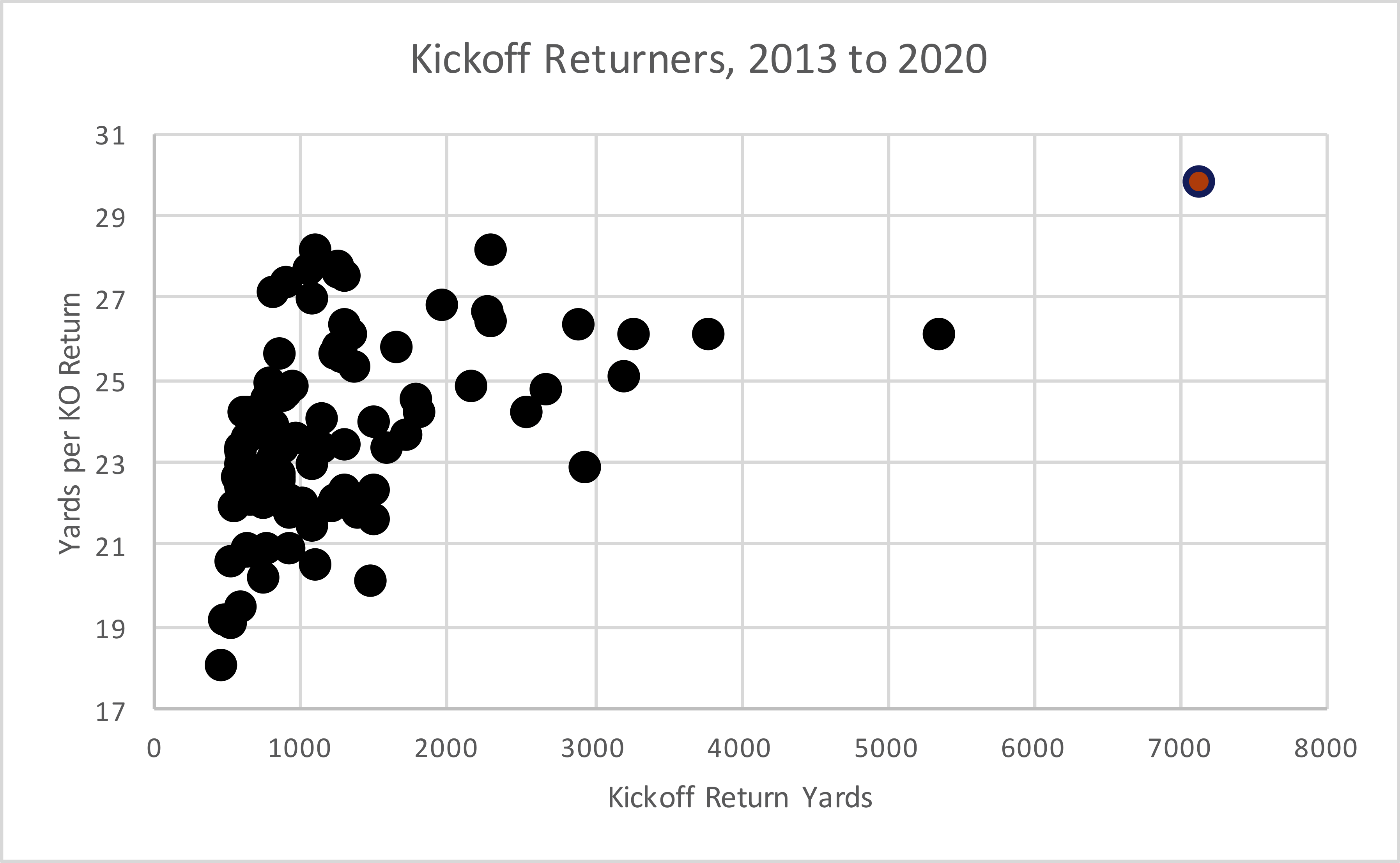 Patterson is the most dominant kickoff returner of our era, and it is not particularly close. The graph below shows the 97 players with at least 25 kickoff returns since Patterson entered the NFL in 2013. Patterson has averaged 1.6 more yards per return than any other player, and he has nearly 2,000 more return yards than anyone else. He has 8 kickoff return touchdowns over the last 8 seasons; no other player has more than two. See if you can spot Patterson in the graph below.