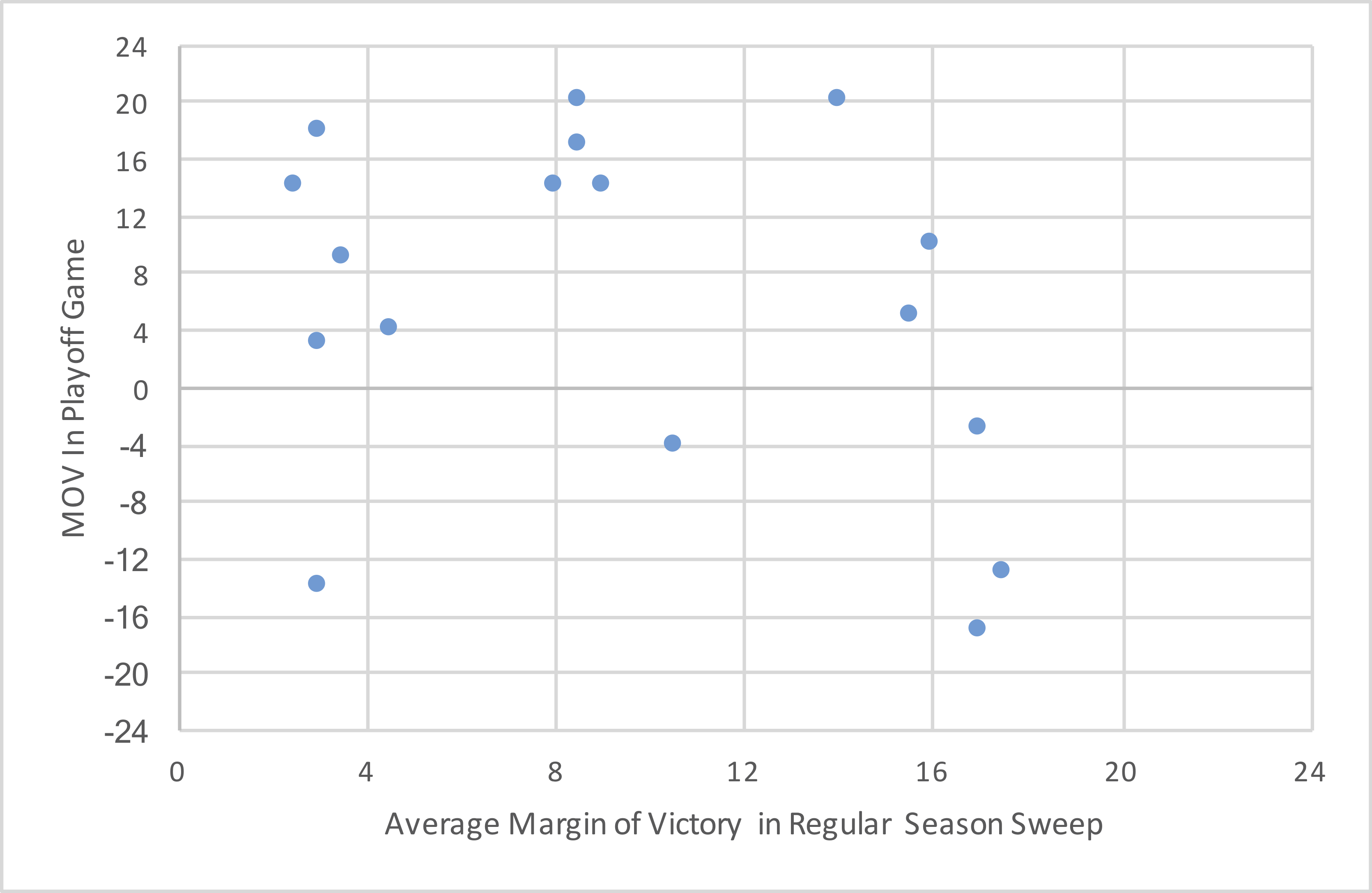 The graph below shows the average margin of victory (on the X-Axis) for the sweeping team in the regular season, along with the results in the playoff game on the Y-Axis. Obviously if the dot is below the 0 line on the Y-Axis, that means the sweeping team lost in the postseason.