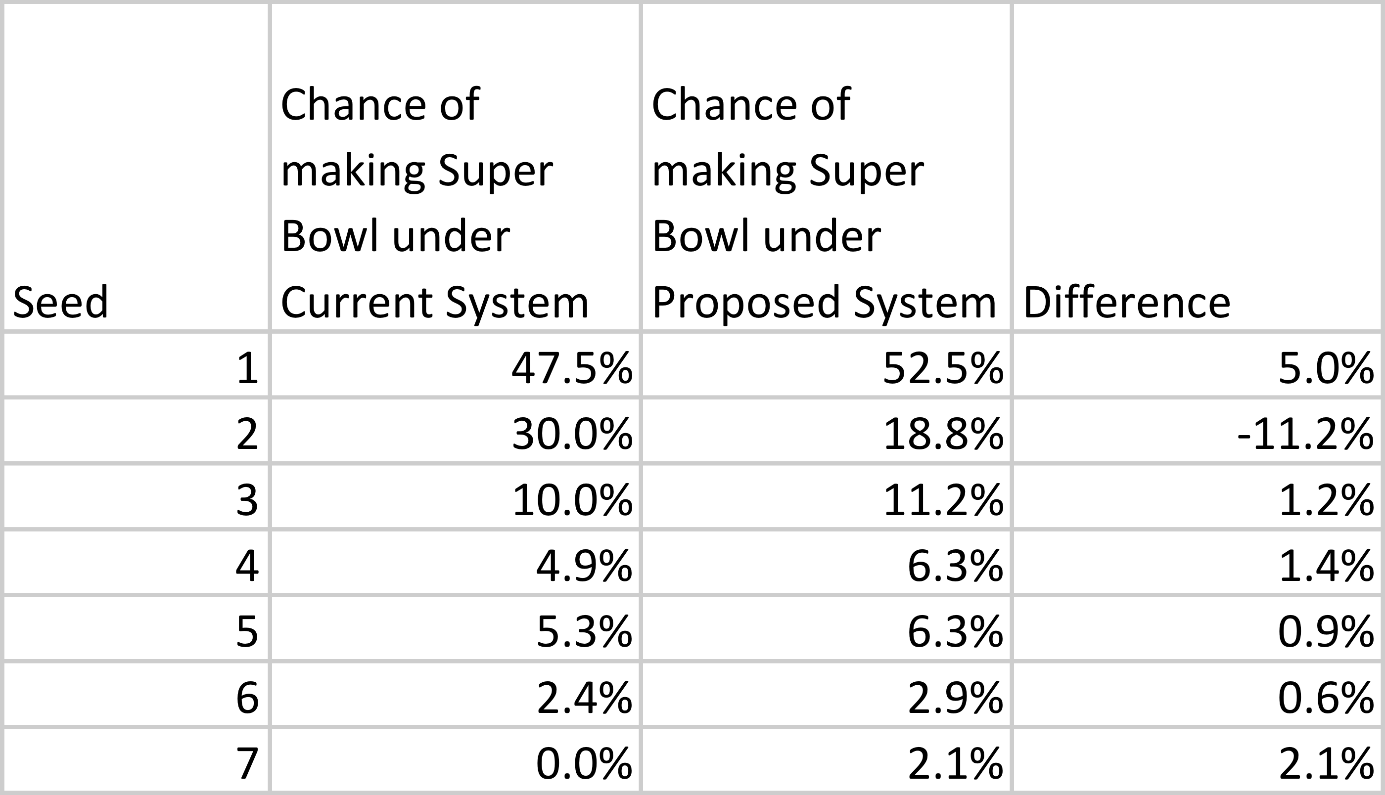 Here’s how I see the changes from the current system to the new proposed system, in terms of each team’s odds of making the Super Bowl.
