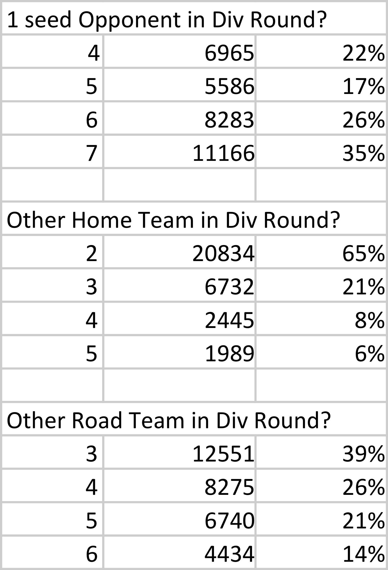 Here, not much has changed: the strongest seed is at home against the other remaining team. But even still, life is probably slightly better for the 1 seed even when it hosts the 2 seed: after all, the 2 seed won’t have had that extra week of rest during the Wild Card round.