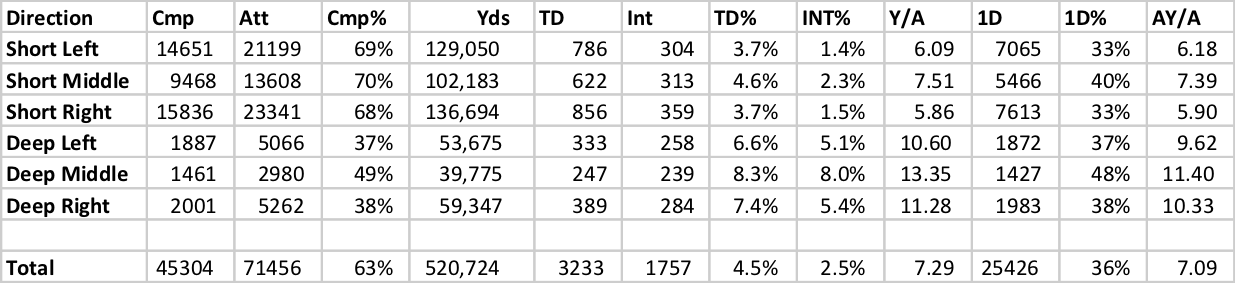 Thanks to the always wonderful PFR Play Index, it’s easy to analyze NFL pass plays by direction. The official play-by-play logs released on behalf of the league label all passes as either short (less than 15 yards from the line of scrimmage) or deep, and either left, middle, or right.